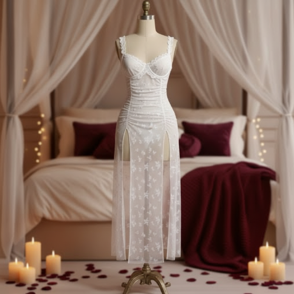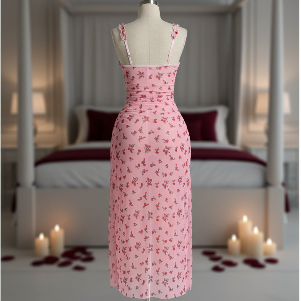 فستان ماكسي شفاف مكشكش بنقشة زهر الورد