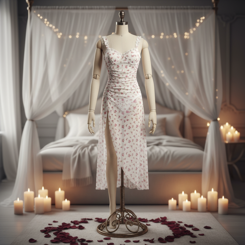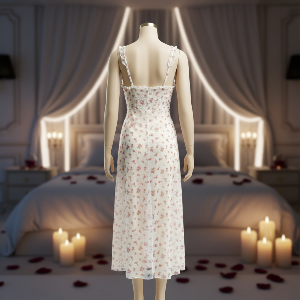 Soft, romantic, and effortlessly graceful. This sheer floral slip dress features delicate ruching through the bodice and a flattering side slit that adds a subtle touch of allure. Light and feminine, it’s perfect for dreamy evenings and elegant lounging moments.