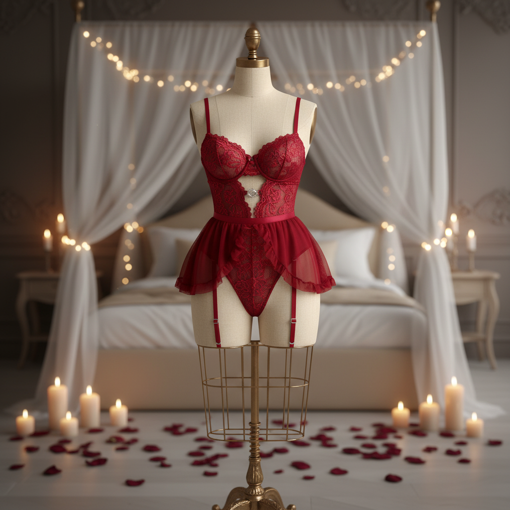 Romantic, bold, and irresistibly feminine. This red lace lingerie set features a beautifully detailed structured top with a delicate front cut-out and a flirty sheer peplum skirt overlay. Designed to enhance your curves while adding movement and elegance to every step.