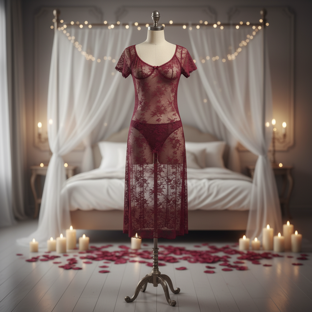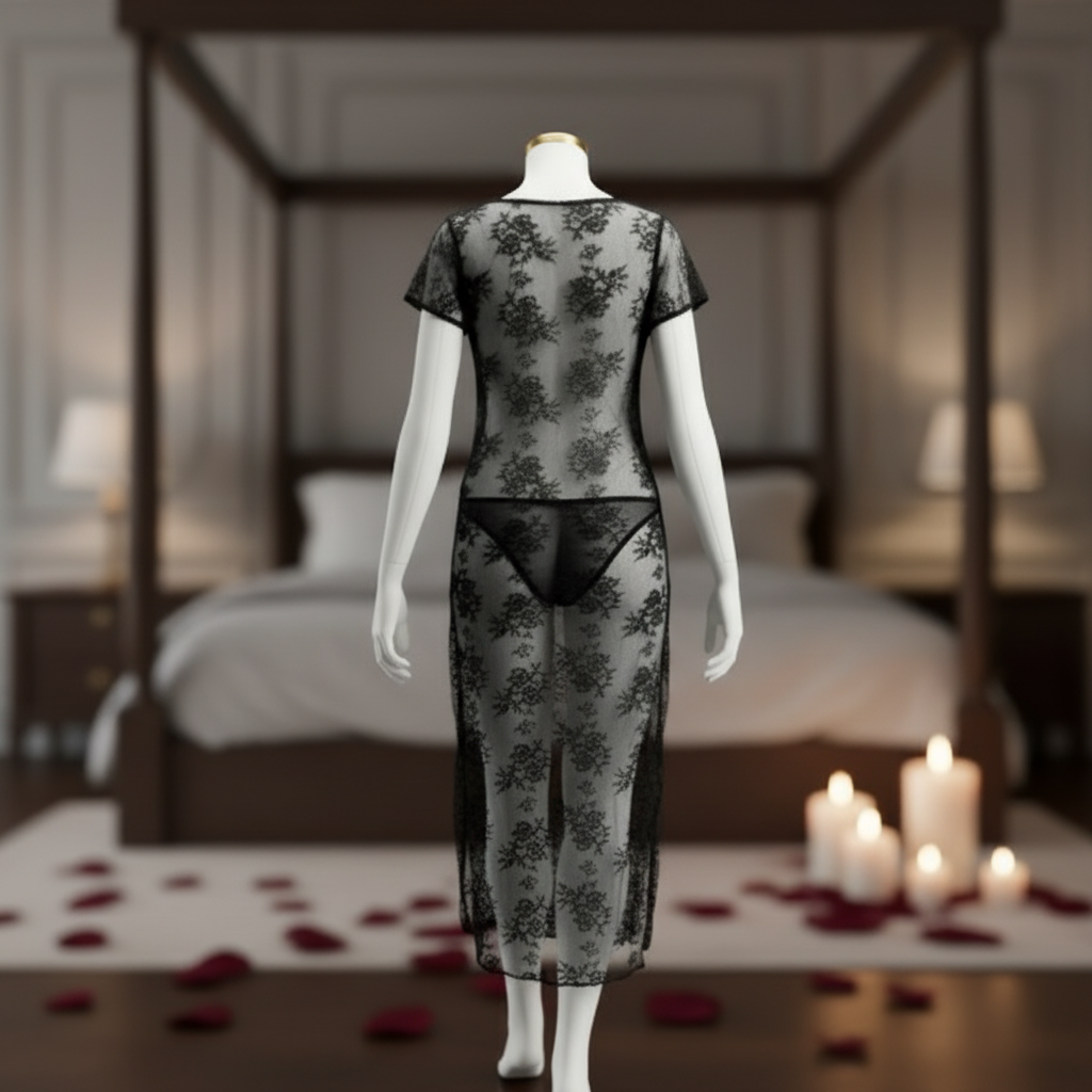 The soft V-neckline enhances femininity, while the short lace sleeves add a subtle romantic touch. The flowing mid-length design drapes beautifully over the body, offering movement and elegance with every step. Lightweight and breathable, it delivers comfort without compromising on sensual appeal.