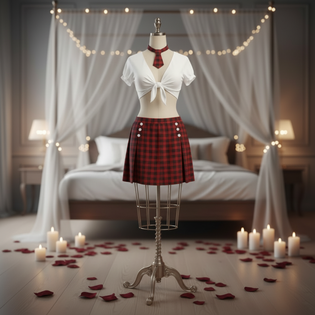 The short-sleeve top is designed with a flattering front tie detail that enhances the silhouette, while the matching plaid mini skirt creates a structured yet playful finish. A coordinating necktie completes the ensemble, adding a distinctive touch that elevates the overall design. Lightweight and comfortable, the fabric allows for easy movement and all-night wear.